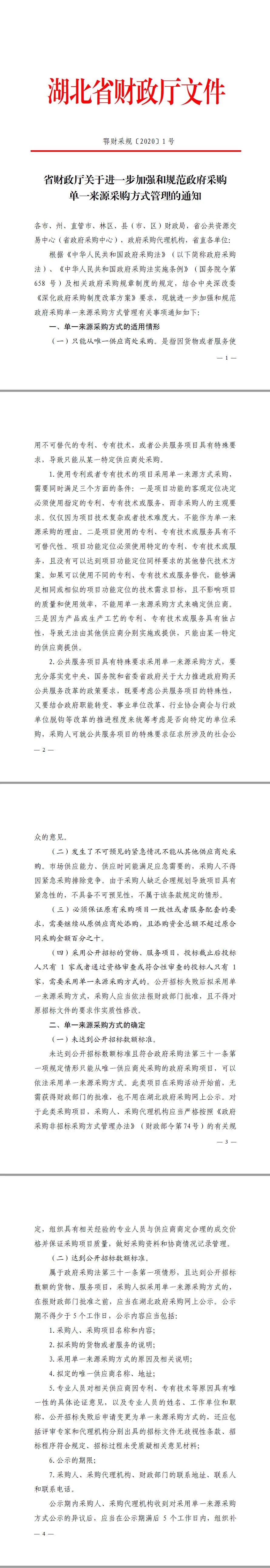 日前,湖北省财政厅印发《省财政厅关于进一步加强和规范政府采购单一来源采购方式管理的通知》(以下简称《通知》)。《通知》以深化政府采购制度改革为主导,以政府采购法律法规为遵循,立足深化放管服改革、加强事中事后监管原则,完善政府采购制度建设,提高政府采购执行效率,提升政府采购服务水平。