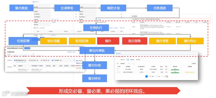 从督办事项内容的定义、重点工作计划制定、任务指派、任务执行和进度反馈、领导批示指导、督办办结,以及领导督办考评,形成更为完善的督办全生命周期管理。