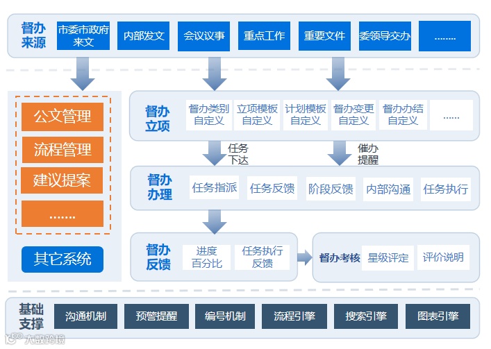 自定义的督办事项内容、重点工作计划制定、任务进度反馈、领导批示、督办变更、办结、考核、统计分析全生命周期的管控 。