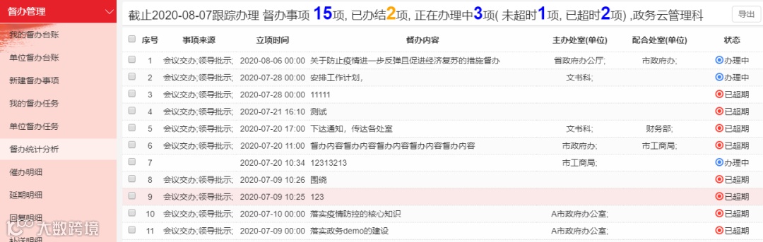 督查部门:随时督办事项进度,定期统计事项办结情况,随时催办和督办;