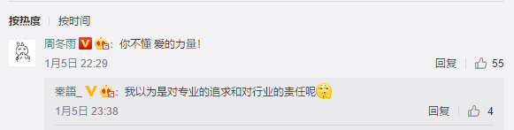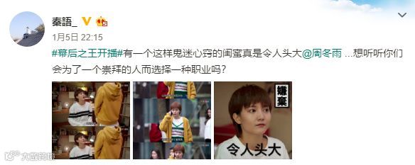 秦语本人也发博表示:“有一个这样鬼迷心窍的闺蜜真是令人头大...想听听你们会为了一个崇拜的人而选择一种职业吗?”周冬雨回复到:“你不懂,爱的力量。”两人逗趣互动,这对姐妹花cp先锁了。