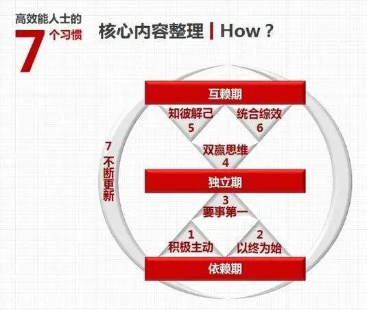 书中讲到,高效能人士的7个习惯分别为:积极主动、以终为始、要事第一、双赢思维、知彼解己、统合综效、不断更新。