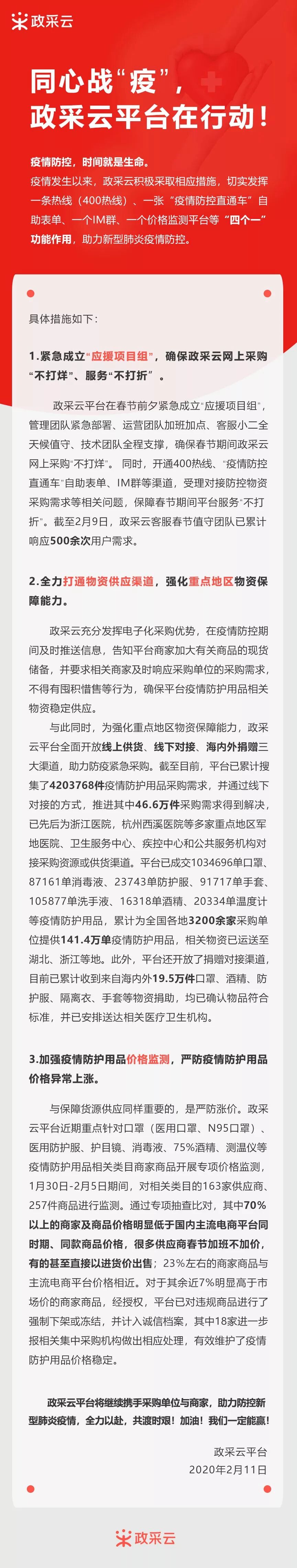 为了促进供需对接,解采购的燃眉之急,给平台用户提供更加放心、贴心的服务,为采供双方搭建一个资源聚合、互动沟通、匹配货源、促成交易的一体化平台,帮助医院、部队等奋战在疫情防控第一线的重点部门发布相关信息,政采云平台抗疫物资采供专区(一期)正式上线!