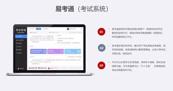 此外,我们还拥有政府采购线上考试系统——易考通,为采购人服务,规范采购代理机构和评审专家的政府采购知识体系,赢得采购人的一致好评。
