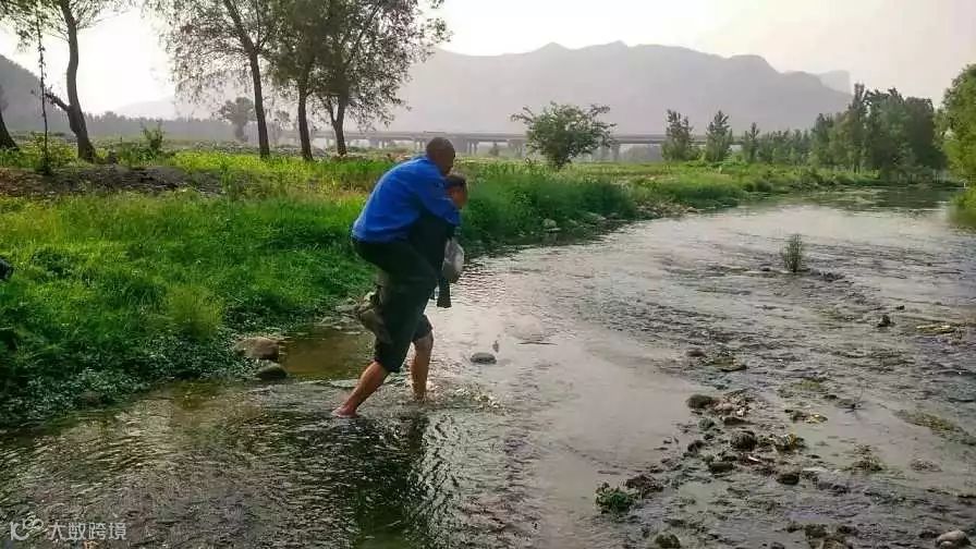过河时,贾海霞帮贾文其卷起裤腿,贾文其就背上贾海霞趟过去。