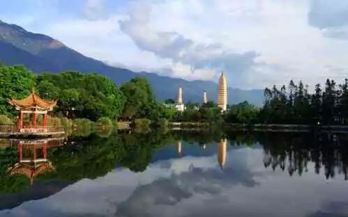 大理崇圣寺三塔,距离下关14千米,位于大理以北1.5千米苍山应乐峰下,背靠苍山,面临洱海,三塔由一大二小三座佛塔组成,呈鼎立之态,远远望去,雄浑壮丽,是苍洱胜景之一。