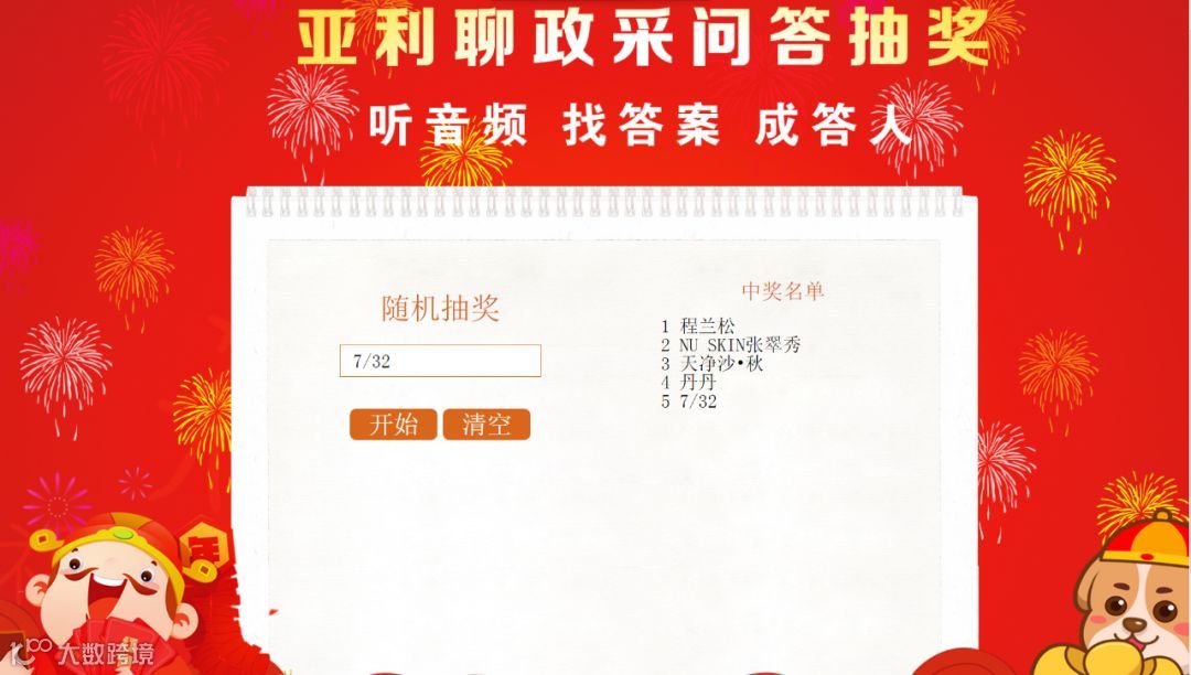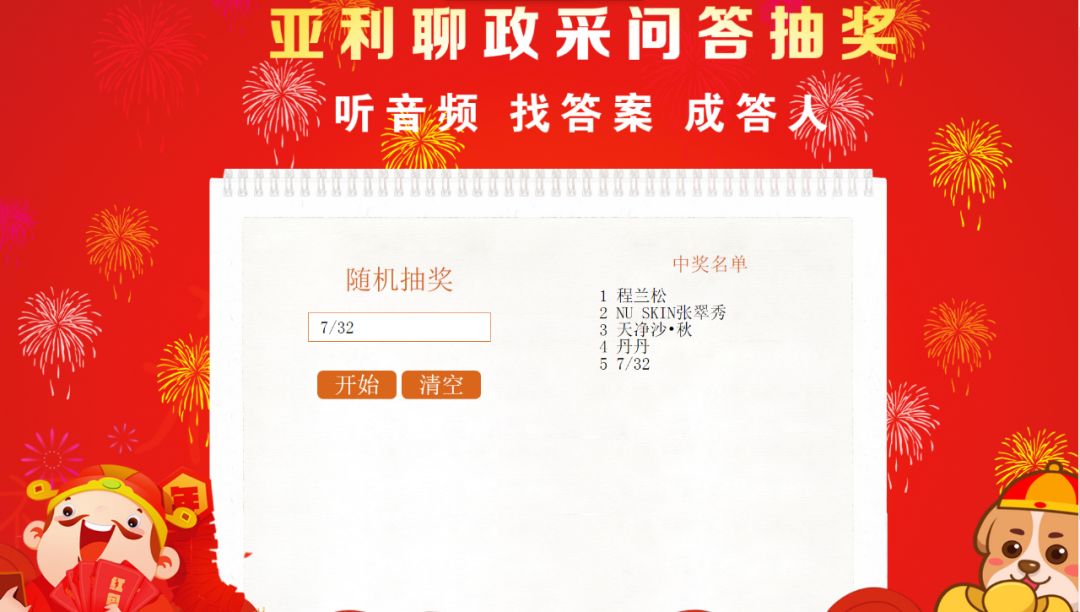 我们从众多提交正确答案的童鞋中,通过公平的“亚利聊政采问答”抽奖系统,随机抽取了五名获奖者,微信昵称为:程兰松、NU SKIN张翠秀、天净沙·秋、丹丹、7/32。