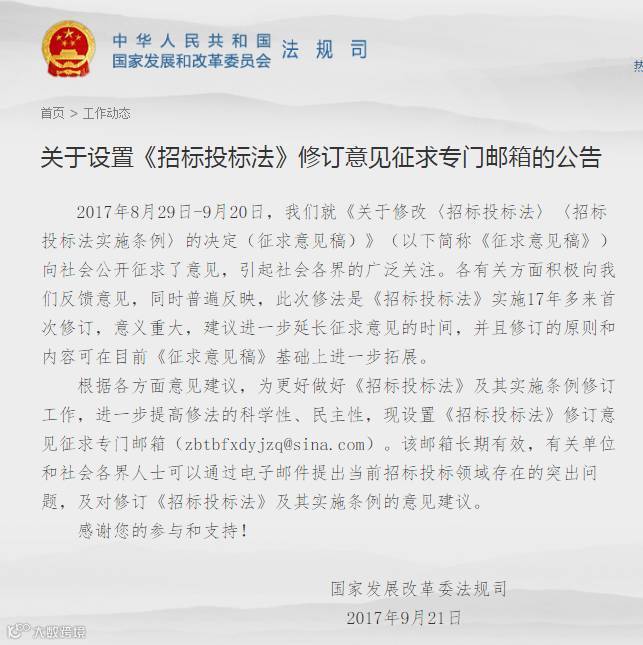 2017年9月21日,国家发展改革委法规司发布“关于设置《招标投标法》修订意见征求专门邮箱”的公告。