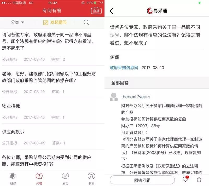 自易采通APP上线以来,“有问有答”频道就受到各方政府采购人士的喜爱,短短8个月时间,“有问有答”频道已收集了三千多个政府采购一线人士遇到的疑难问题及专家同行给出的解决方案。