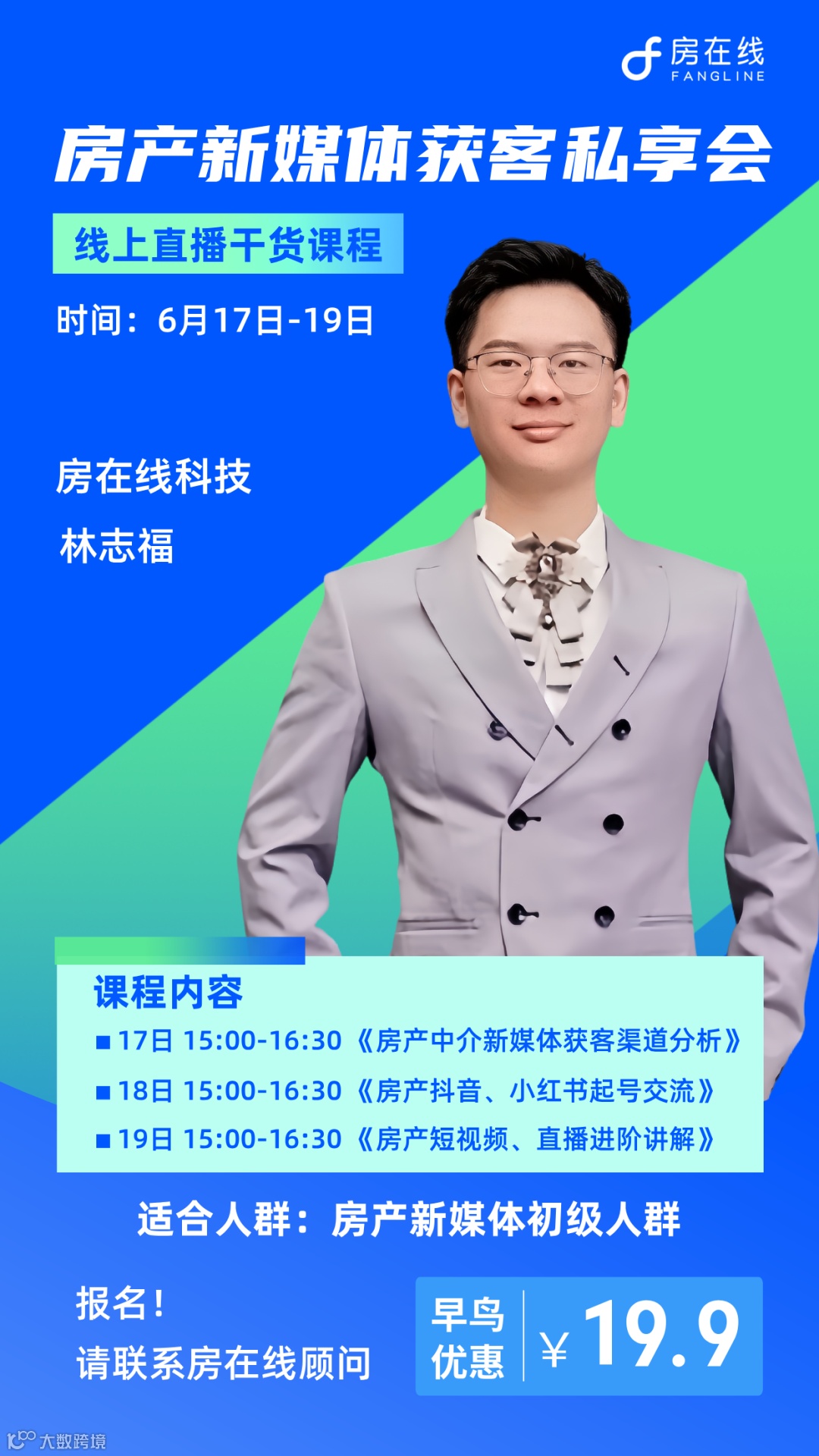 6月17日-19日,房在线重磅推出 「房产新媒体获客私享会」,3天纯干货直播课,从0到1教你打通抖音、小红书、视频号流量入口,把线上流量变成实实在在的成交客户!