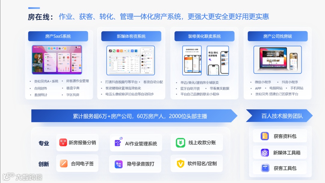 国内知名的房产科技公司,致力于让房产行业更高效,希望成为百万经纪人信任的科技品牌。一直秉承用户第一、创新、简洁、敬业的核心价值观为客户提供好产品和好服务。累计服务了全国6万+房产中介公司60万+房产经纪人。研发了超能获客房产SaaS系统房在线、房产获客微信小程序、房产获客抖音小程序、房产网站、合同电子签约、数字化系统、隐号拨打、房源采集、软件冠名等产品,帮助房产公司提高管理、提高效率、获得客户、获得房源和提高业绩!