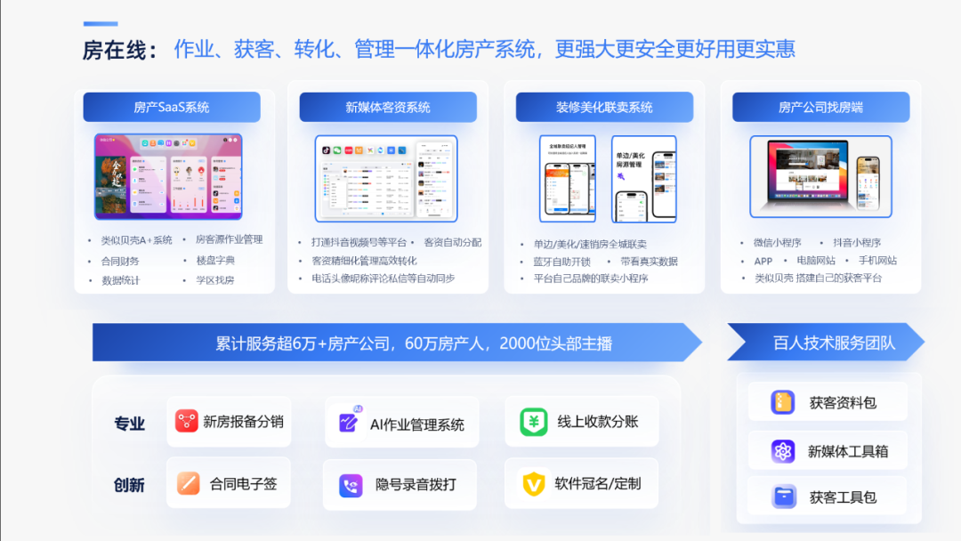 国内知名的房产科技公司,致力于让房产行业更高效,希望成为百万经纪人信任的科技品牌。一直秉承用户第一、创新、简洁、敬业的核心价值观为客户提供好产品和好服务。累计服务了全国6万+房产中介公司60万+房产经纪人。研发了超能获客房产SaaS系统房在线、房产获客微信小程序、房产获客抖音小程序、房产网站、合同电子签约、数字化系统、隐号拨打、房源采集、软件冠名等产品,帮助房产公司提高管理、提高效率、获得客户、获得房源和提高业绩!