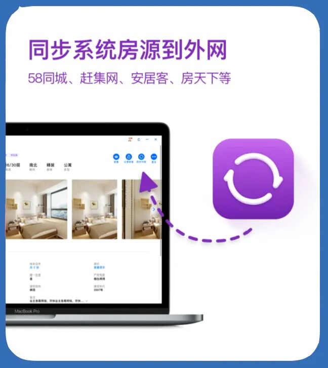 有了同步外网,发房不再繁琐。它可以将系统内的房源一键群发到58安居客、房天下、百姓网等各大房产网站,节省大量的工作时间,大大提高经纪人的工作效率。