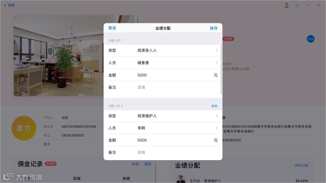 现在,你可以把业绩分配比列直接修改为按金额分配,比如房源录入人在此单总应得多少金额。