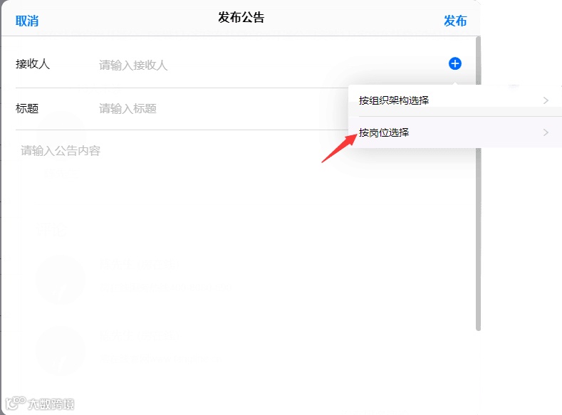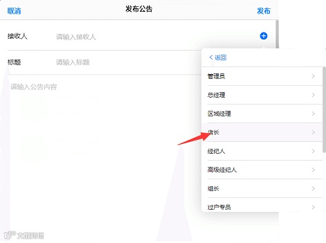 发布公告还可以按照组织架构选择(片区、门店)或者根据岗位发布,比如店长会议只发布给店长查看。