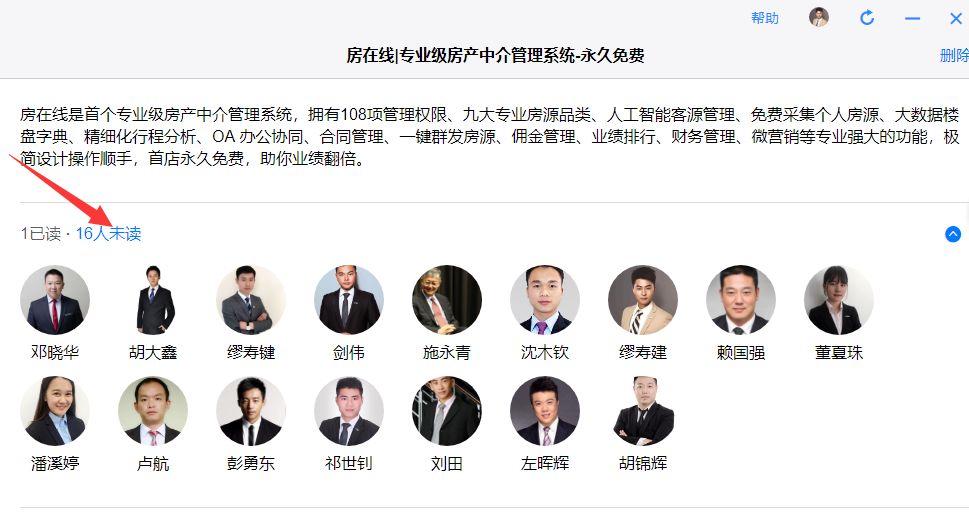 公告可以显示几人已读,几人未读,点击未读,查看未读人员,一目了然信息的传达效果。