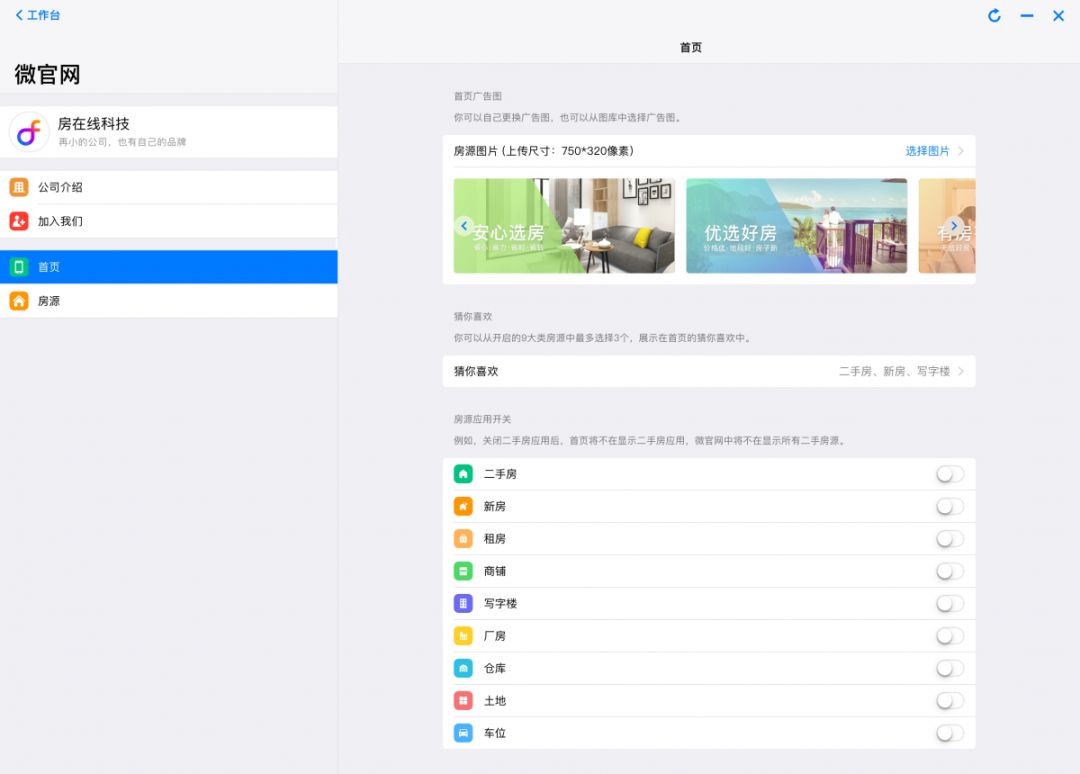 你可以自主控制微官网所要展示的房源类别,例如,关闭二手房应用后,首页将不显示二手房应用,微官网中将不显示所有二手房房源。