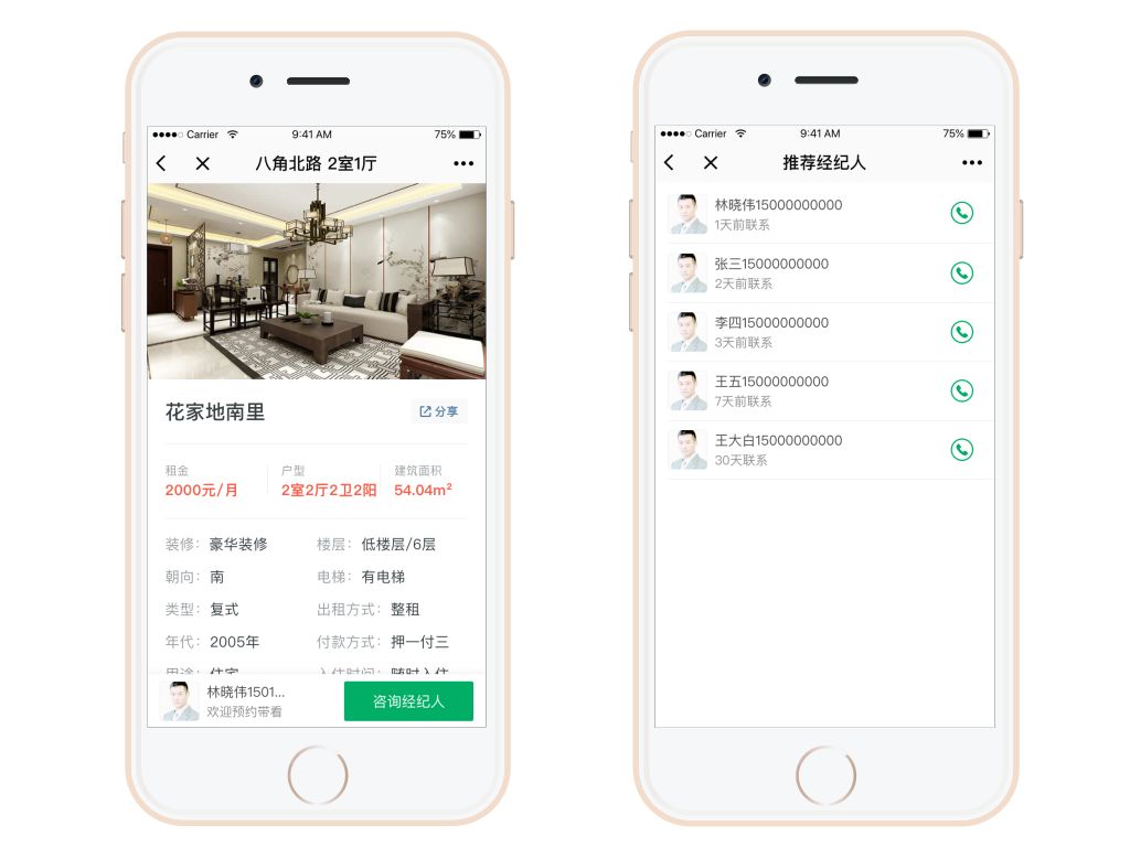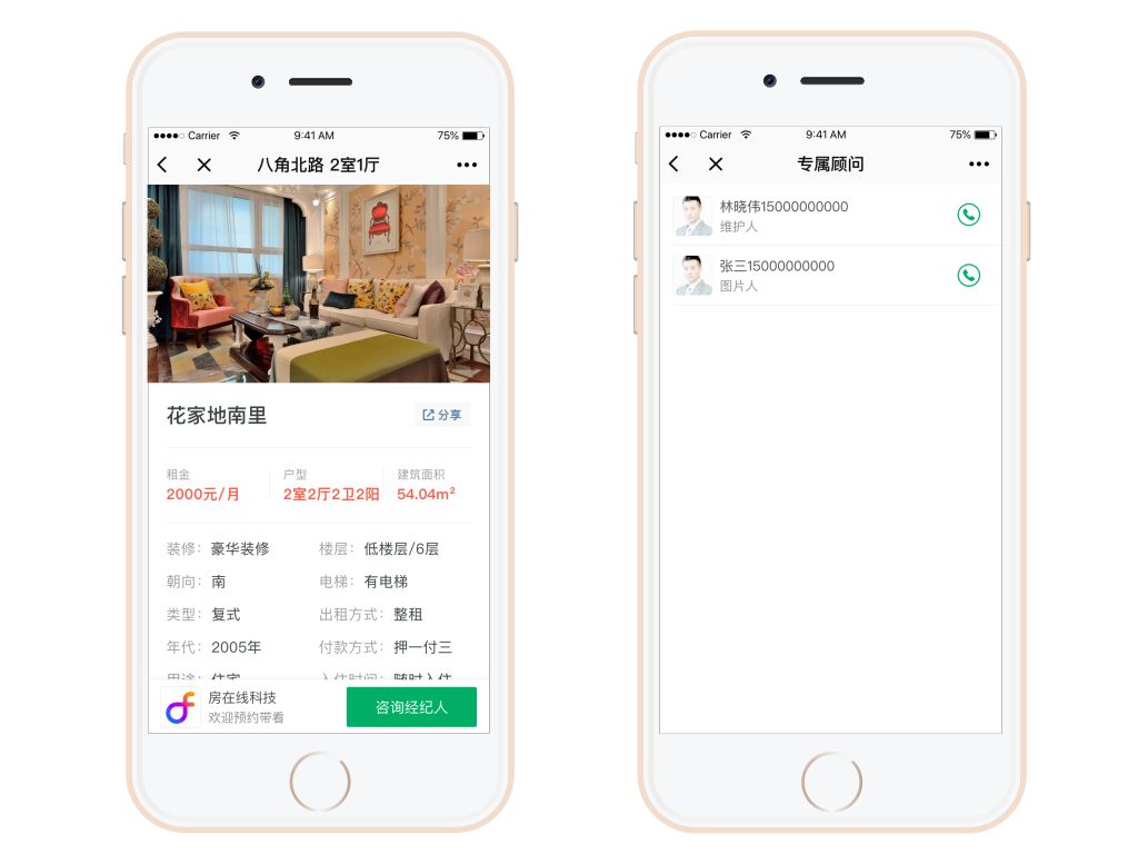 如果有多个经纪人给客户发过公司的微官网小程序,客户从微信聊天列表或小程序入口等方式进入,则按分享时间列出所有分享过的经纪人及其联系方式。