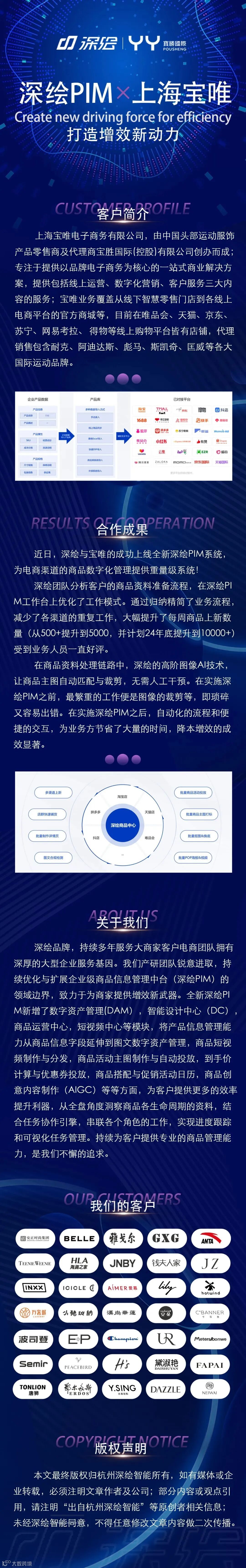 深绘智能为上海宝唯推出的全新深绘PIM系统成功上线。客户电商渠道商品数字化管理注入了“深绘力量”,工作模式大幅优化,降本增效成果卓著。