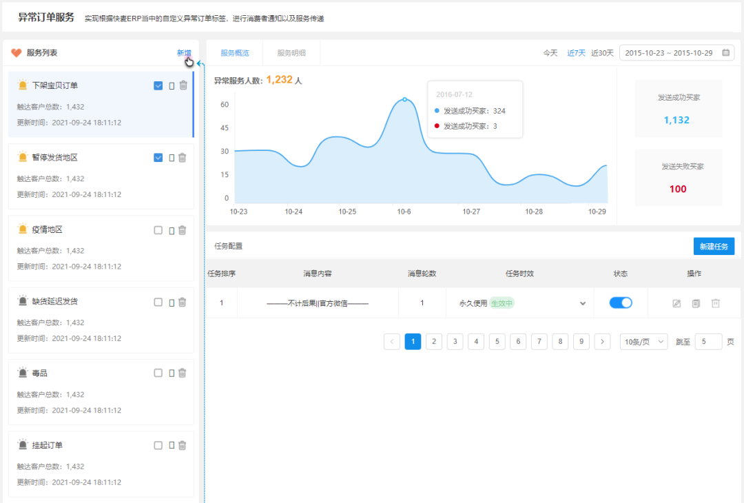 针对ERP中未发货的异常订单如商品问题、缺货、疫情影响等,小智【异常服务】会根据不同异常标签,自动发送异常服务话术,进行买家安抚以及告知,大大减少客服的筛选和发送工作量。并且发送时间和子账号都支持自定义,同时会统计话术发送数据和明细,服务情况一目了然。