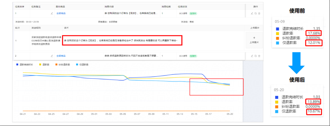 利用【退款申请关怀】功能挽回客户退款流失,针对买家退货,发送退款挽回话术,客户流失有效抑制,退款率下降4%。