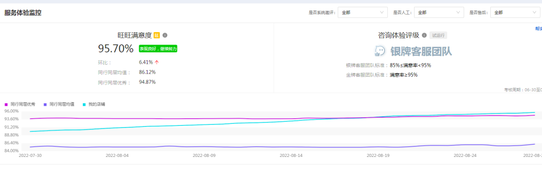 凭借【感谢意图】大幅提升旺旺满意度,在快麦小智知识库【感谢意图】中配置主动邀请服务评分,近一个月旺旺满意度提升7%达到95%,有望成为服装类目金牌客服团队,大大增加店铺权重排名。
