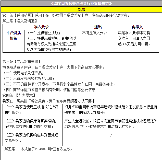 ■ 新增淘宝餐饮美食卡券类目发布商品的卖家准入、清退、再准入要求,商品发布要求及违规处理办法。