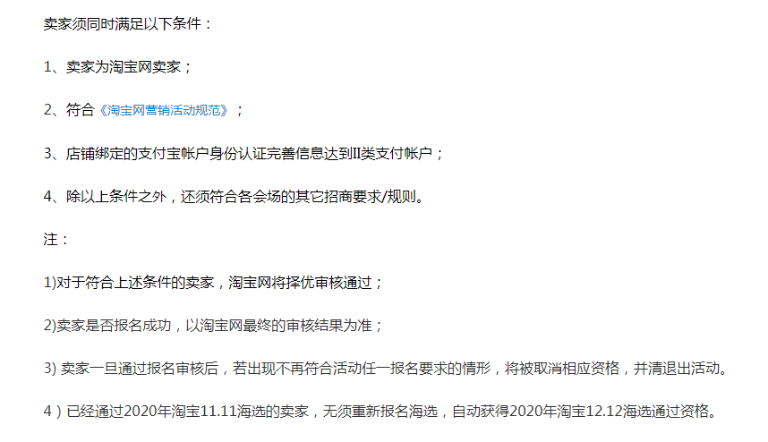 其中,已经通过2020年淘宝11.11海选审核的卖家,可以免报名、免审通过2020年淘宝12.12的海选,无需再次报名2020年淘宝12.12的海选。