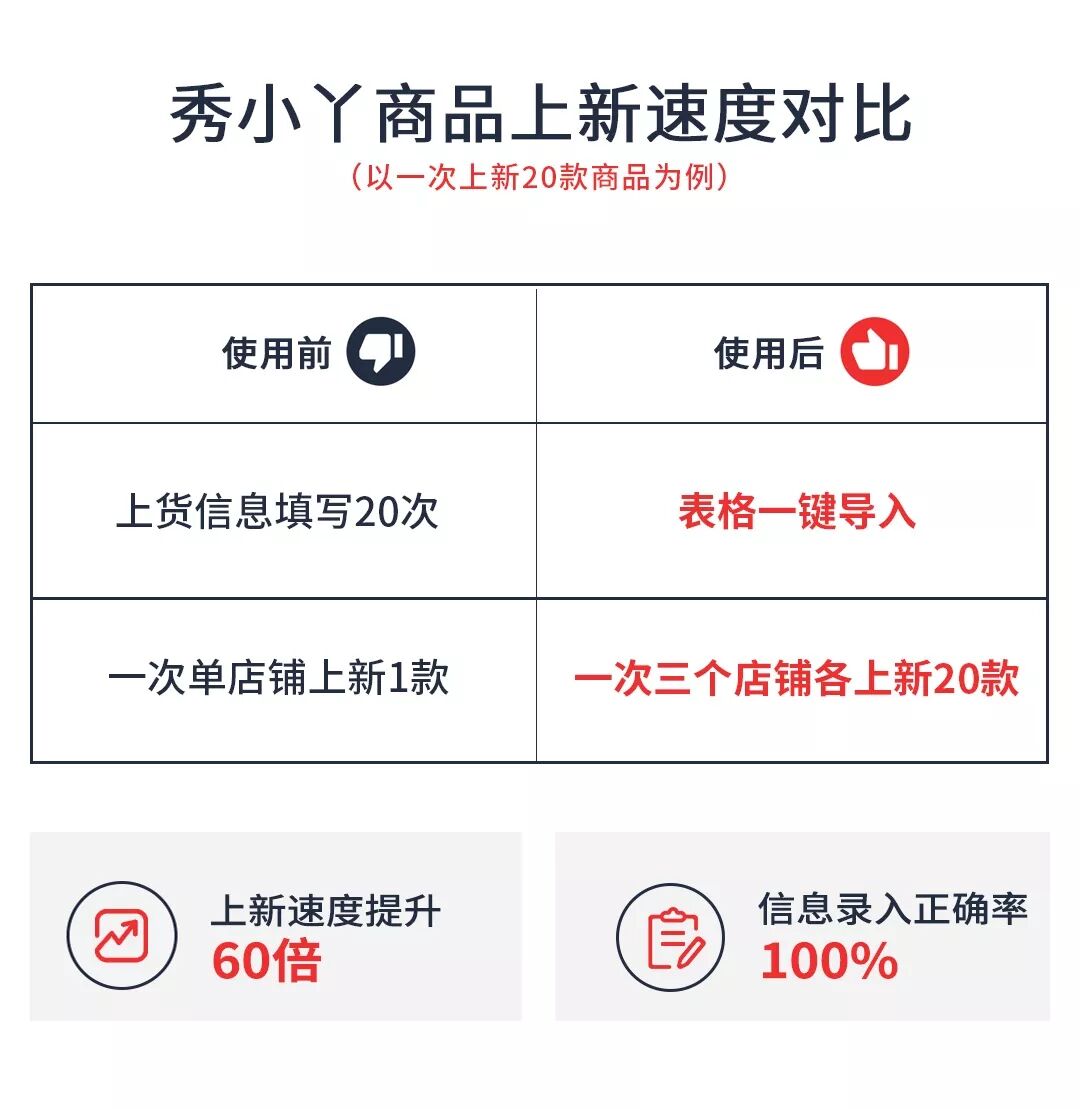 秀小丫的日常上新工作非常机械化,比如一款商品需要上新到多个店铺,就需要在多个店铺后台重复录入商品信息。并且人工操作,难免会信息录入出错。使用快麦详情机器人之后,商品上新信息可以不限款数一键表格导入。软件支持一次批量上新20款,同时可以一键将同款商品复制到多个店铺,避免重复劳动。在保证信息录入无误的前提下,至少为秀小丫提高人效60倍。