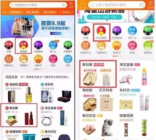 另外,位于功能区域的“聚划算”频道也修改为“今日爆款”频道。据了解,“今日爆款”主要按不同品类整理出整点时段的热销商品榜单,并对其销量进行展示,有利于增加聚划算商品的推广和曝光。