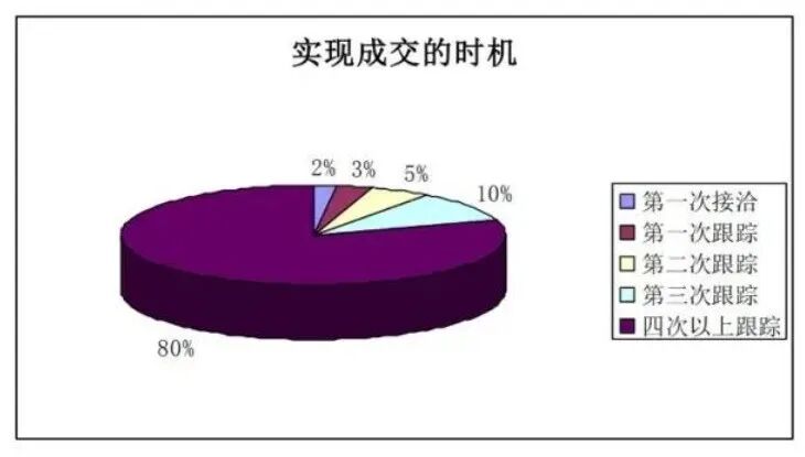 2%的销售是在第一次接洽时完成的;3%的销售是在第一次跟踪后完成;5%的销售是在第二次跟踪后完成;10%的销售是在第三次跟踪后完成;而80%的销售来源于四次以上的跟踪。这说明了销售人员的跟踪工作对于成功交易的重要性。