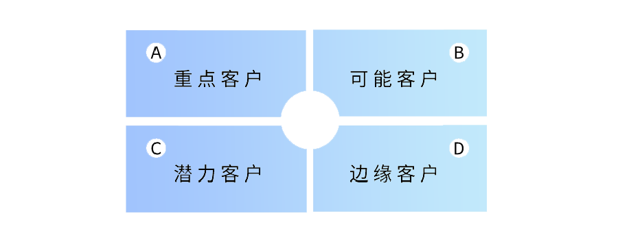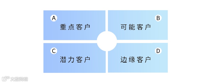 2,根据客户的时机情况,运用“四象限法”(是美国的管理学家科维提出的一个时间管理法则,其要义是把工作按照重要和紧急两个不同的程度进行了划分,基本上可以分为四个象限:既紧急又重要、重要但不紧急、紧急但不重要、既不紧急也不重要。这里将其代入到“客户分级”中。)将客户分为: