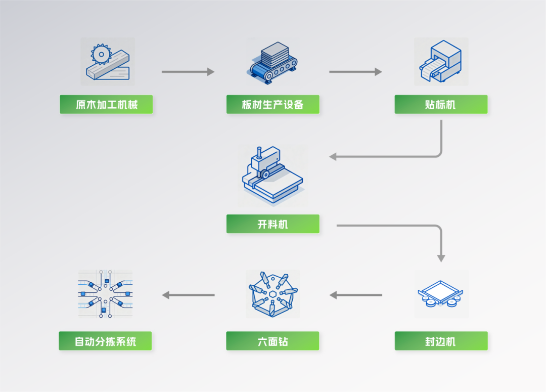 木工开料机主要工艺流程包括:上料-定位-吸附-钻孔-开料-下料-除尘。
