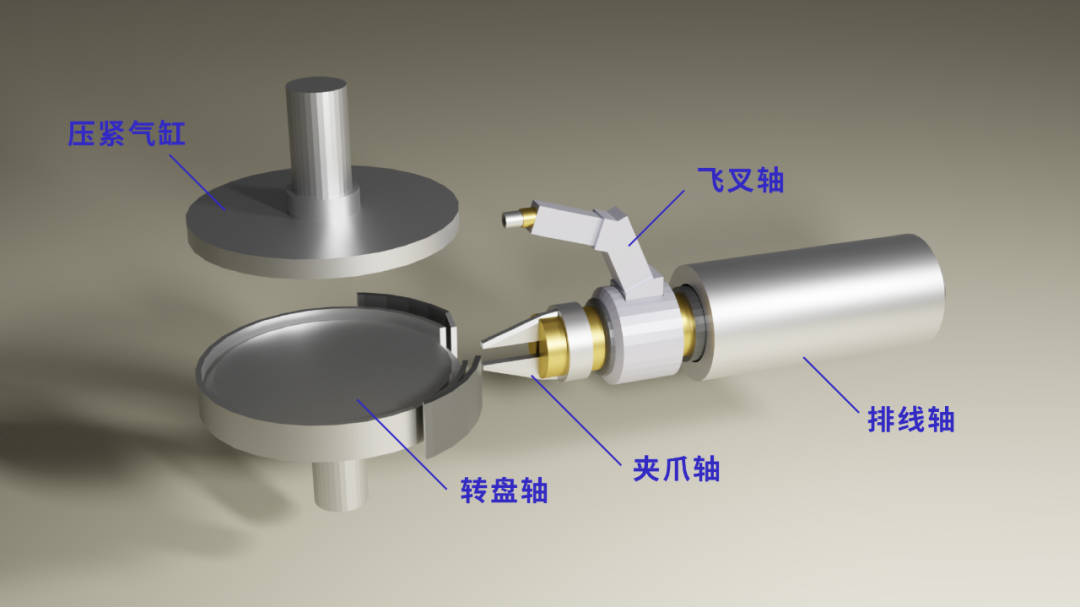 由排线轴以及飞叉轴组成,在飞叉旋转的同时,排线轴向前或向后同步运动,两者配合将铜线绕在电机定子的线槽上。