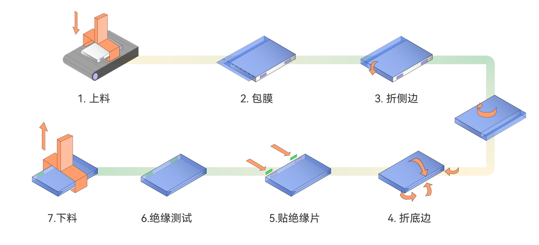 包膜工位放卷蓝膜并进行涂胶,推入电池后经过上下滚筒滚平完成电池3面包覆。