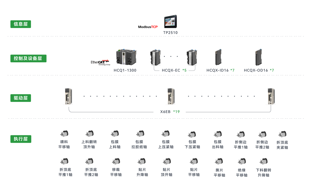 禾川包膜机共有7个工位,分别是:上料、包膜、折侧边、折底边、贴绝缘片、绝缘测试、下料。