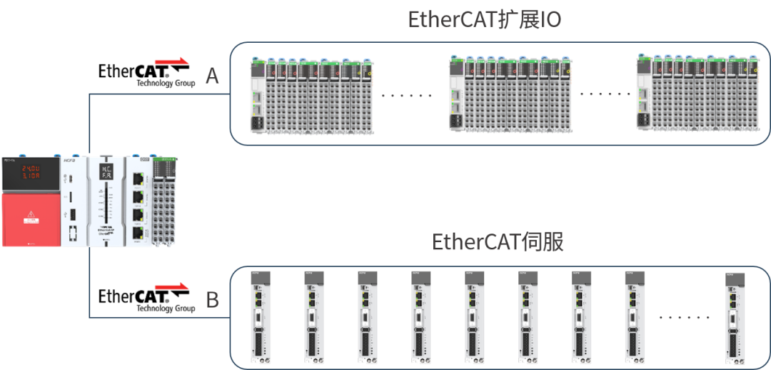 双EtherCAT主站:可实现运动控制+逻辑控制的独立运行, 项目维护简单、设备运行更稳定可靠。