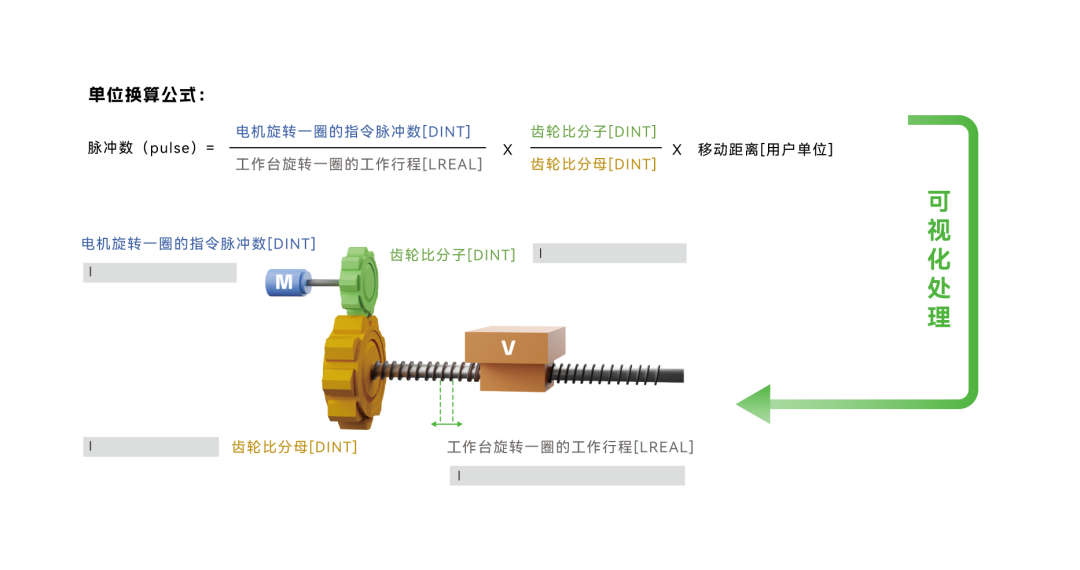 提供清晰可视的外部物理拓扑结构(根据线性轴和旋转轴进行区分)以配置电子齿轮比,单位换算过程结合实际应场景, 简单直观、清晰易懂。