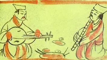 魏晋乐师且奏且饮图中盘中明显有两双筷子(甘肃嘉峪关魏晋墓砖画)