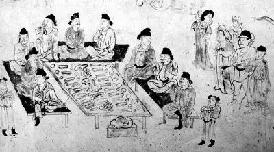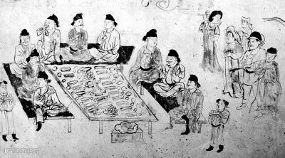 唐代墓葬野宴图壁画,餐桌上同时见到箸与勺