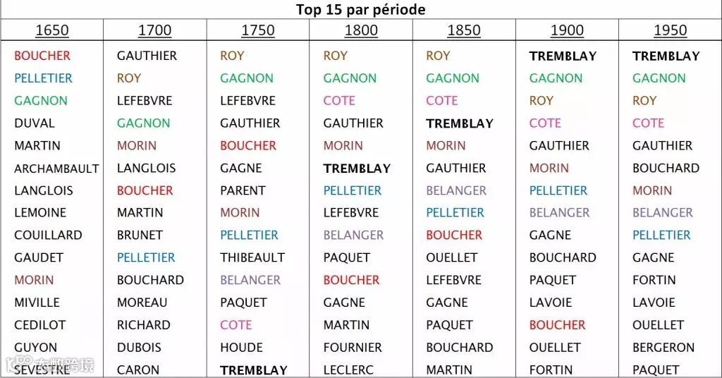 ▍各个时期魁北克排名前15的姓氏