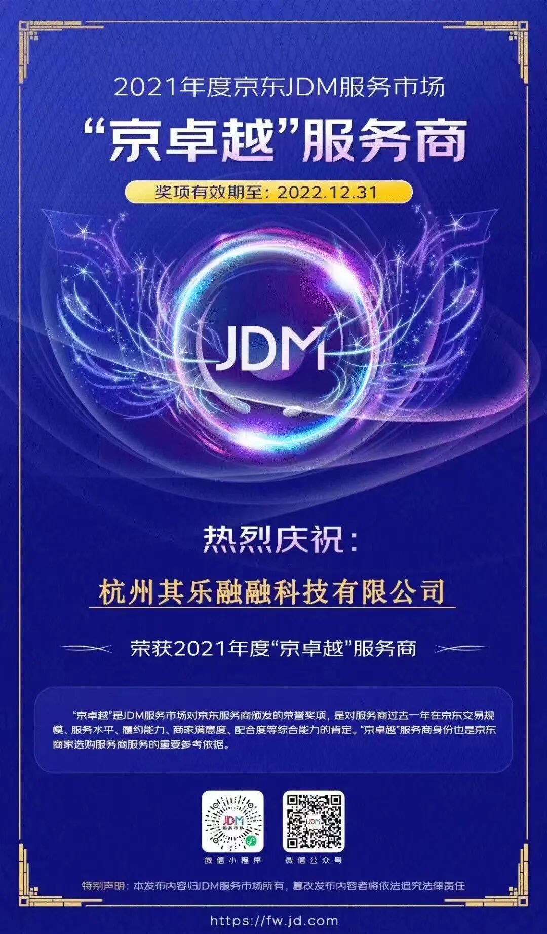 光云科技旗下快麦ERP(杭州其乐融融科技有限公司)荣获京东颁发的“京卓越”服务商