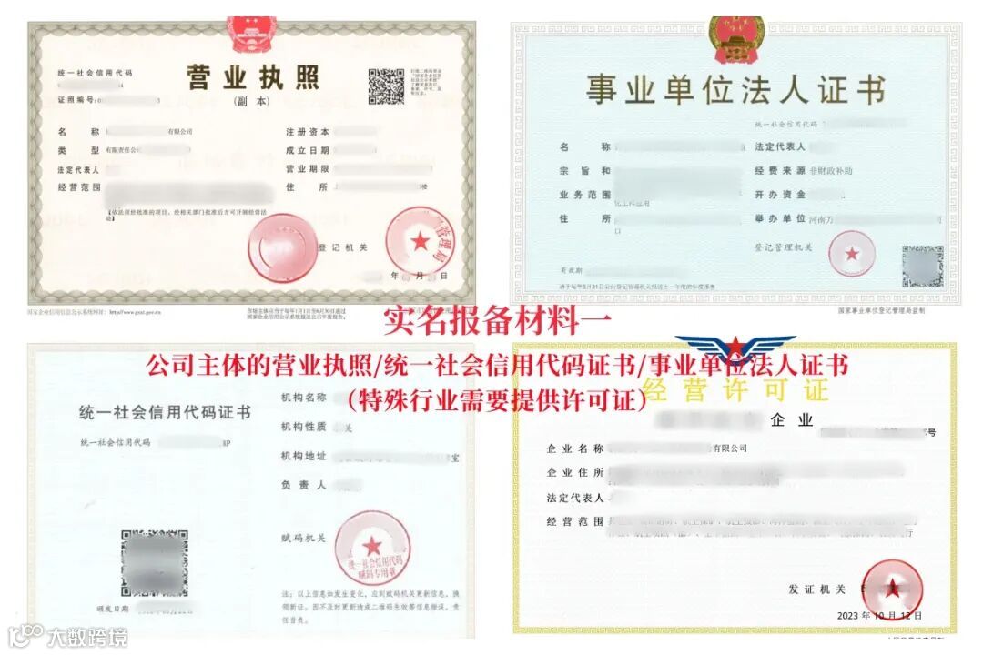 公司主体的营业执照 / 统一社会信用代码证书 / 事业单位法人证书提供其一。特殊行业需要额外提供许可证。没有资质无法报备签名,也就无法使用。