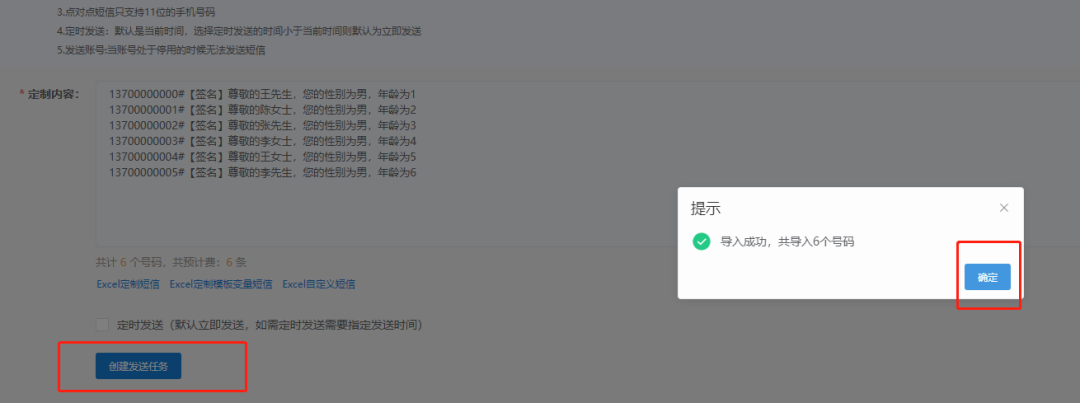 4.导入后检查短信是否正确,点击确认,创建任务发送即可。