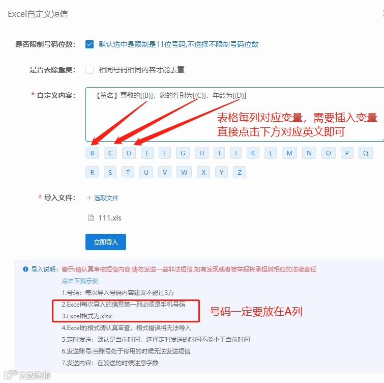 3.导入表格,编辑好内容,按需求点击下方对应的英文插入变量,点击立即导入。