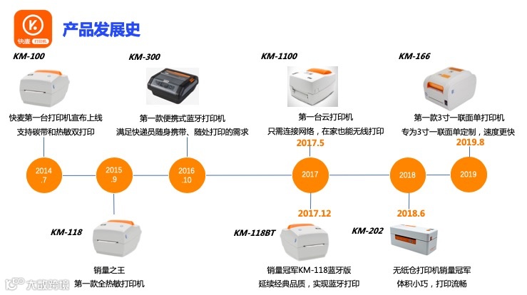 经过6年的沉淀,快麦打印机已经成为行业领军者。自2014到2019年,快麦连续推出了KM-300首款便携式打印机,解决了外出携带、随处打印的需求,成为快递从业者最爱的机型;推出无纸仓打印机KM-202,体积小巧,打印稳定,一经推出便收到用户的喜爱。