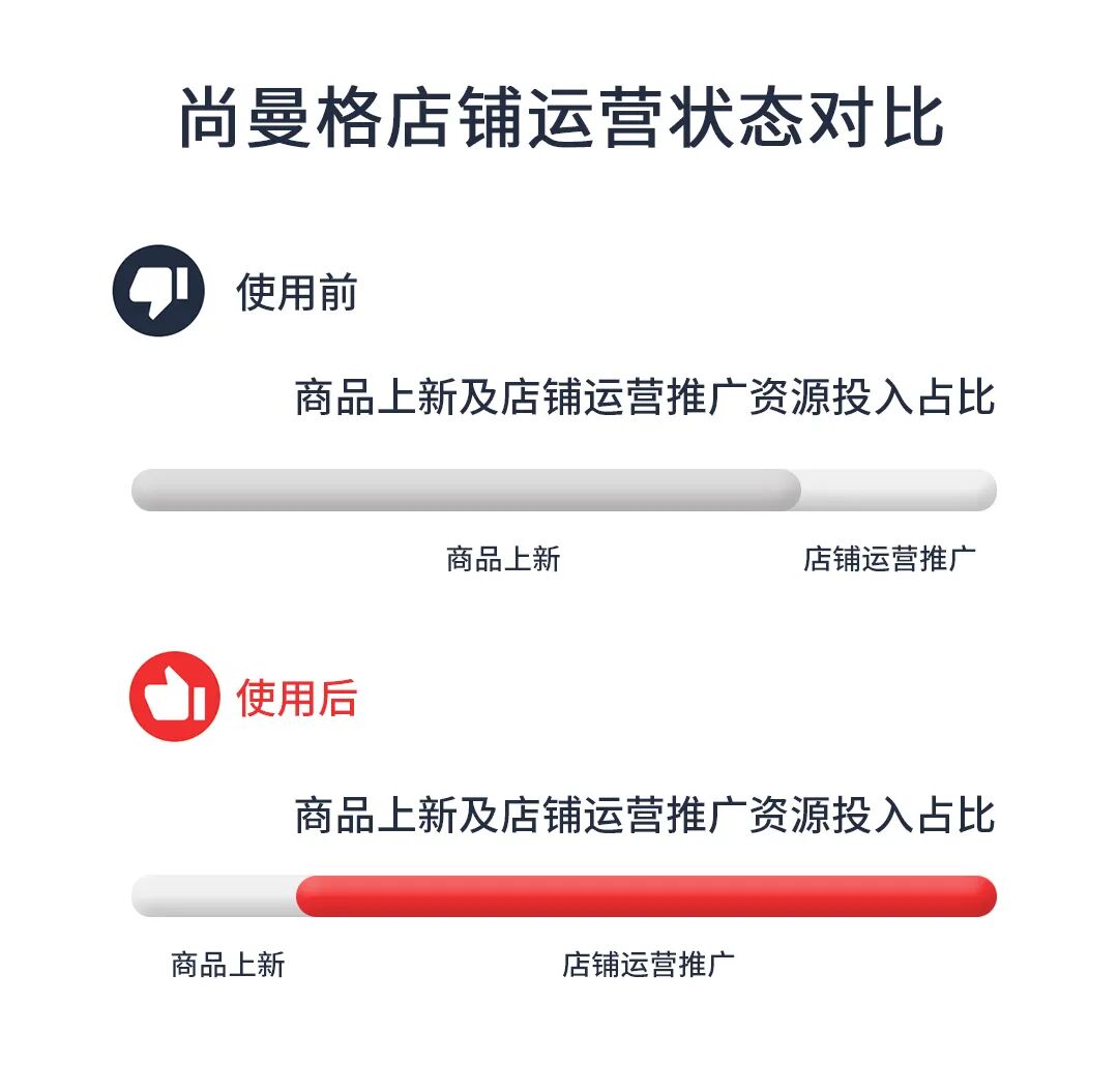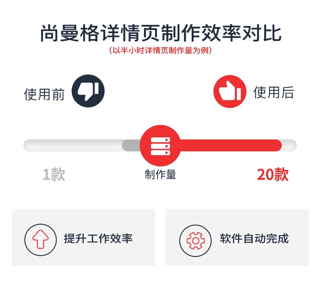 合作前,尚曼格详情页相关的图片排版、文案填写、切片导出都需要人工重复操作,半小时只能制作一款详情页。合作后,快麦详情机器人结合图像识别领域的相关技术,快速处理尚曼格上传素材包,自动生成符合店铺需求的详情页。现在通过软件,半小时能够完成20款详情页制作。