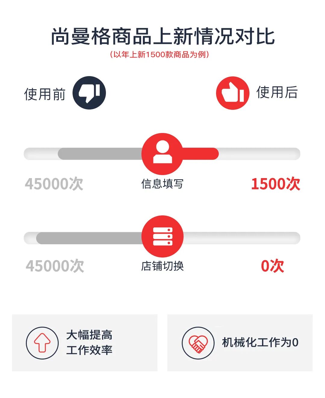 尚曼格在多个电商平台开设了近30家店铺,一款商品上新需要人工重复输入商品信息。而尚曼格的年上新量超过1500款,需操作45000遍才能完成商品上新,工作量十分庞大且存在大量机械化工作。快麦详情机器人支持多平台多店铺同步上新,商品信息只需填写一次,即可完成多渠道上新。彻底去除机械化工作,大幅提高工作效率。