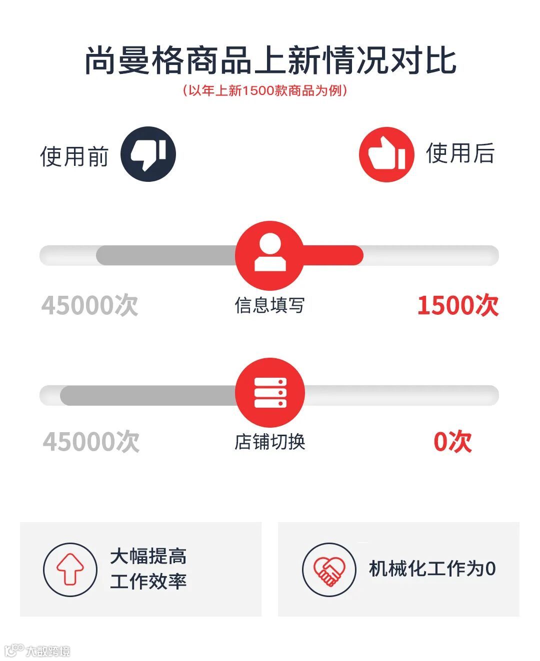 20年3月起,尚曼格旗下店铺的所有详情页均由快麦详情机器人制作而成。截至目前,已经累计完成近1500个详情页制作和45000款商品上新。借力快麦详情机器人高效完成商品上新,实现加快店铺运营节奏。