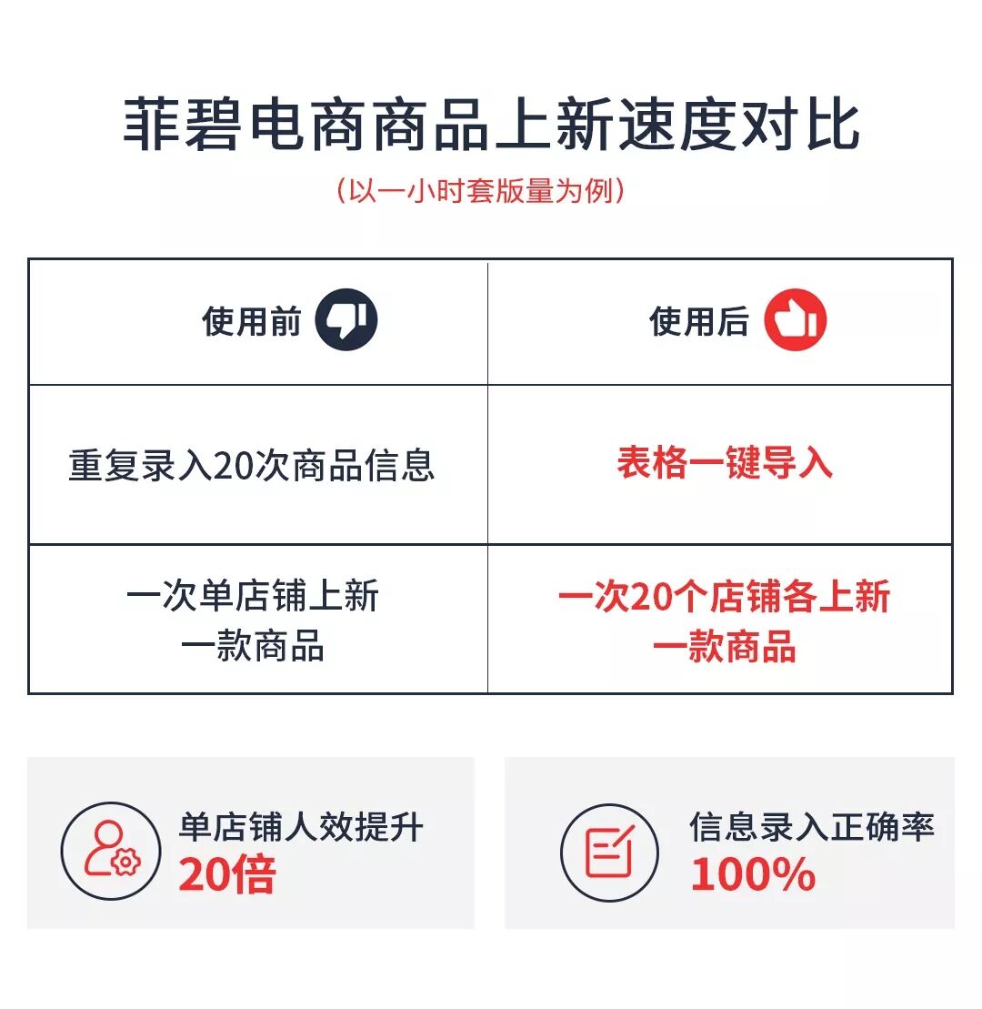 菲碧电商旗下有20家店铺,也就是说完成一款商品上新,需要运营人员在二十个店铺后台重复录入商品信息,占据非常多的时间和人工投入。这个过程非常机械化,而且极易出错。